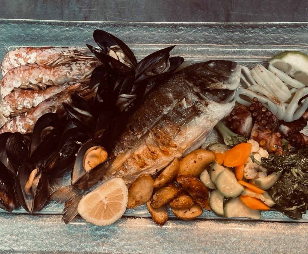 1 fish,4 large shrimps,squid,octopus,mussels with boiled vegetables and greens